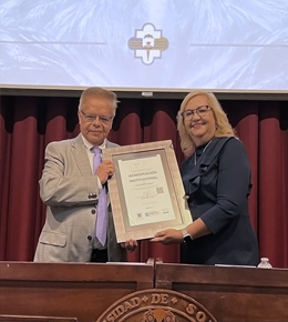 Miguel Ángel Tamayo Taype, coordinador general de los Ciees, fue el encargado de entregar a la rectora María Rita Plancarte Martínez dicha distinción, no sin antes reconocerle y felicitarle por su entrega, compromiso y liderazgo en su gestión al frente de la universidad.