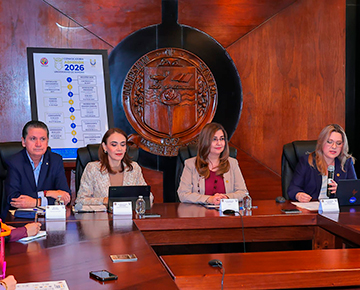 La rectora Dena María Camarena Gómez, acompañada de Karla Mercedes López Montes, directora de Planeación y Evaluación; Milka del Carmen Acosta Enríquez, directora de Servicios Escolares; y Jesús Moreno Durazo, director de Comunicación, anunció la convocatoria que inicia este 4 de febrero.
