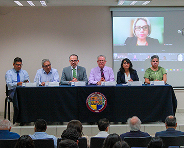 En el presídium participaron las personas coordinadoras de los pares evaluadores de los CIEES: Miguel Ángel Vallejo Hernández, para la Licenciatura en Física; Rosalva Pérez Gutiérrez, para la Licenciatura en Geología; Clara Romero Cruz, para Ingeniería Industrial y de Sistemas; y Adrián Espinosa Bautista, para Ingeniería Mecatrónica.